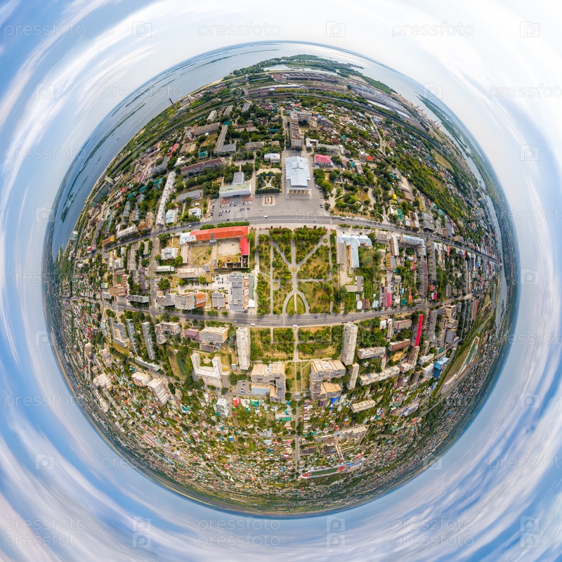 Сызрань, Россия. Аэрофотоснимок центральной части города. Вид на Волгу. 360-градусный панорамный астероид