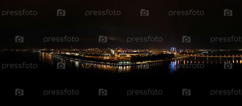 Пермь, Россия. Ночная панорама набережной Камы в городе Перми с Камского моста. С высоты птичьего полета