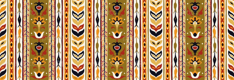 Геометрический дамасский орнамент. Икат границы. Этническая вышивка с листьями и монограммами. Племенная векторная текстура. Бесшовный народный узор в ацтекском стиле. Индийский, скандинавский, цыганский, мексиканский, африканский ковер