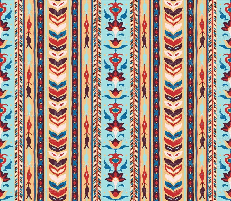 Геометрический дамасский орнамент. Икат границы. Этническая вышивка с листьями и монограммами. Племенная векторная текстура. Бесшовный народный узор в ацтекском стиле. Индийский, скандинавский, цыганский, мексиканский, африканский ковер