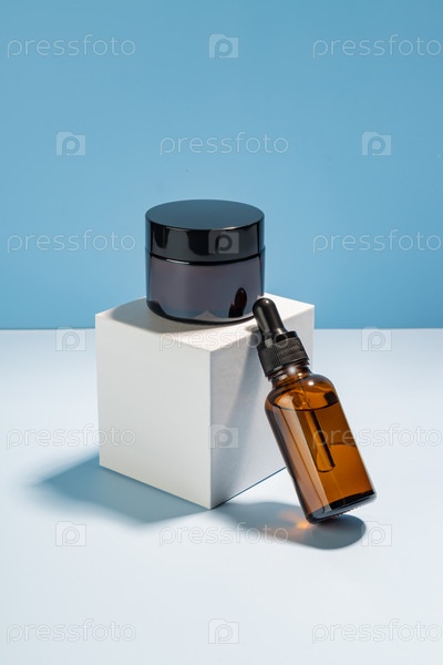 Антивозрастная коллагеновая сыворотка для лица в бутылке из янтарного стекла и крем для лица на белом фоне подиума с копией пространства. Натуральная органическая косметика. Макет для брендинга