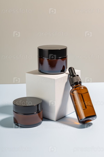 Сыворотка для лица в стеклянной бутылке-капельнице и баночках с кремом на подиуме из белого куба. Масло гиалуроновой кислоты, сыворотка с коллагеном и пептидами, средство по уходу за кожей. Макет для бренда