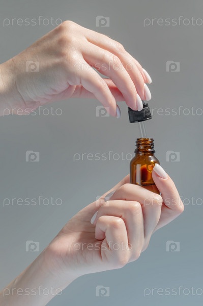Женская рука с капельницей эфирного масла, ароматерапевтической эссенцией, косметической сывороткой или лекарственной жидкостью на бежевом фоне. Небрендированные бутылки для вашего дизайна