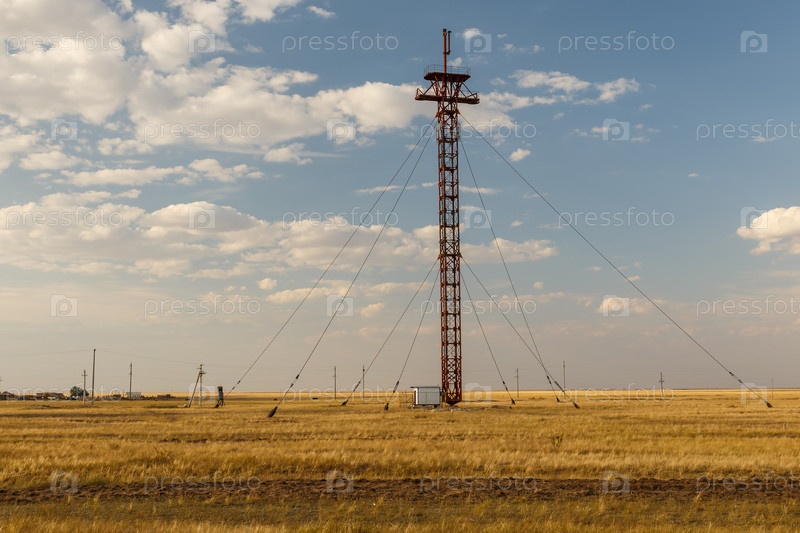 Железная вышка сотовой связи со стальными тросами в степи