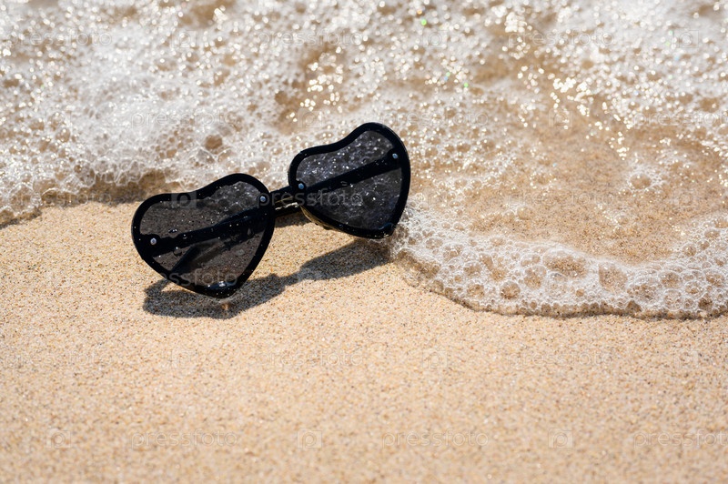 Наслаждайтесь отдыхом у моря. Солнцезащитные очки в форме сердца на песке в морской волне