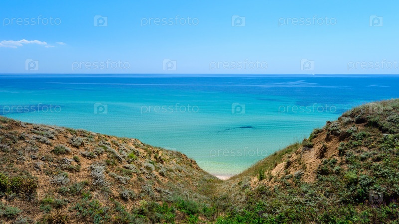 Морской пейзаж и холмы на переднем плане. Райский дикий пляж