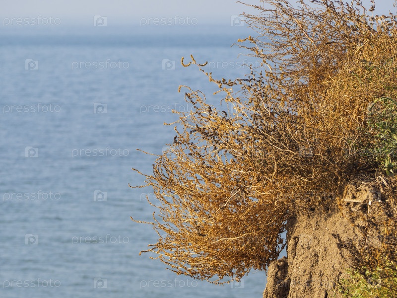 Сухая желтая трава на глиняной скале берега на фоне моря. Туризм и отдых на море. Желтая сухая трава на берегу моря