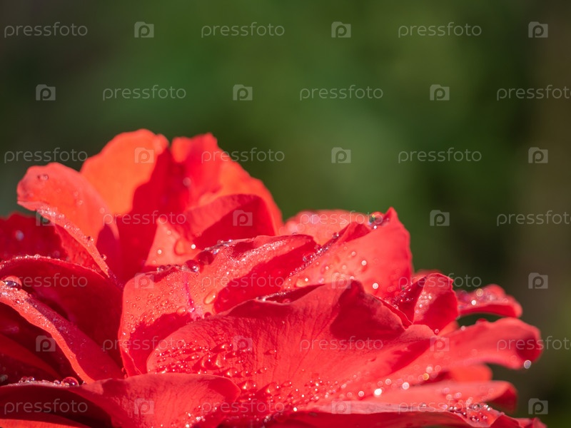 Красная роза с каплями воды после дождя в летнем саду. Крупный план цветка розы на зеленом фоне