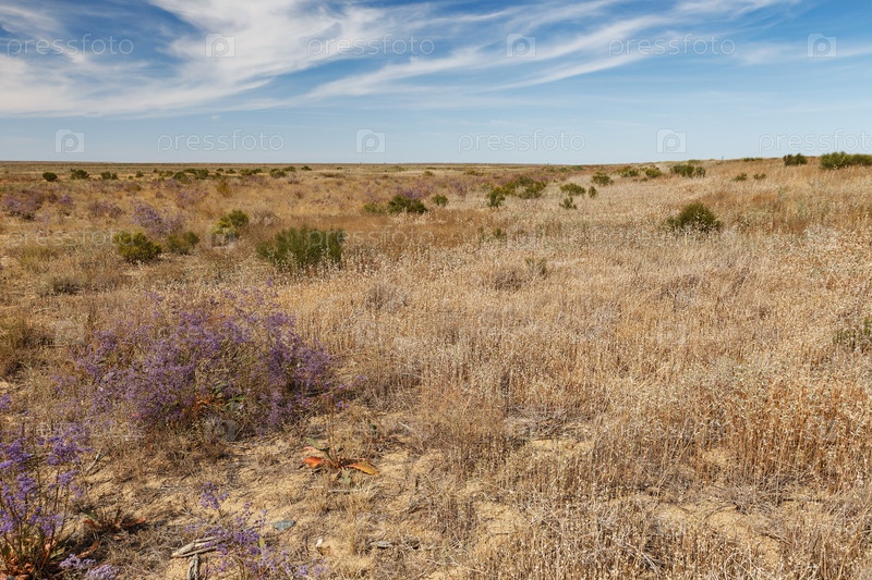 Степь в Казахстане. Сухая трава и цветущий кустарник в степи