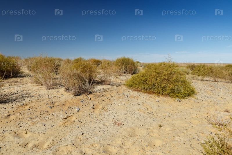 Зеленые кусты в песчаной пустыне, степи в Казахстане