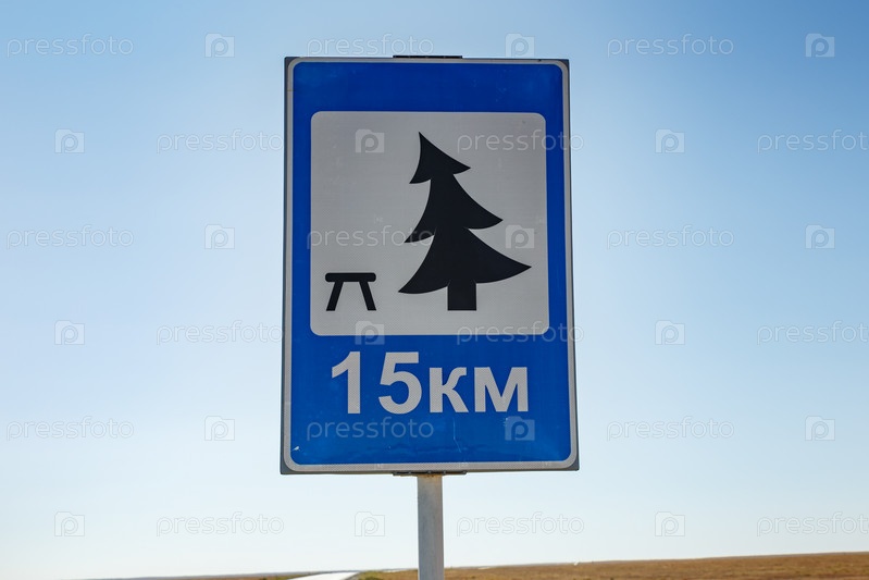 Дорожный знак место отдыха впереди, дорожный знак на фоне голубого неба