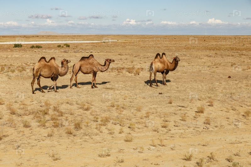 Три двугорбых верблюда идут по песчаной пустыне в Казахстане