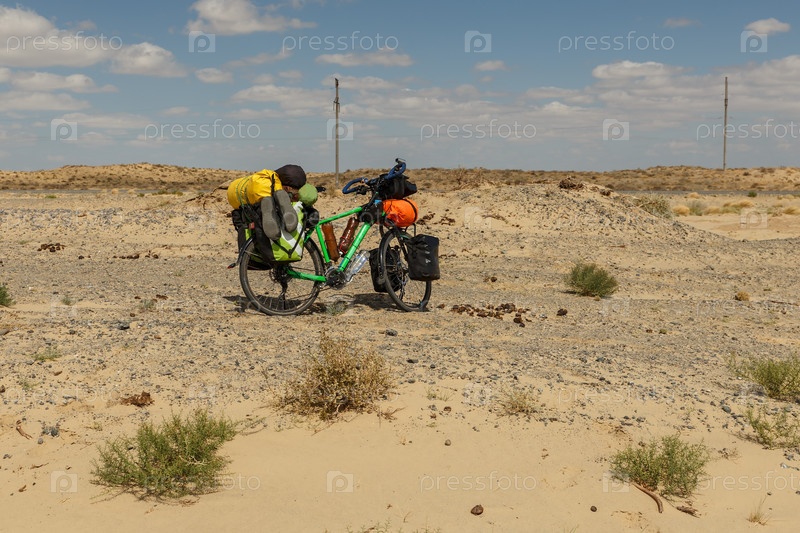 Велосипед для путешественника стоит в степи Казахстана