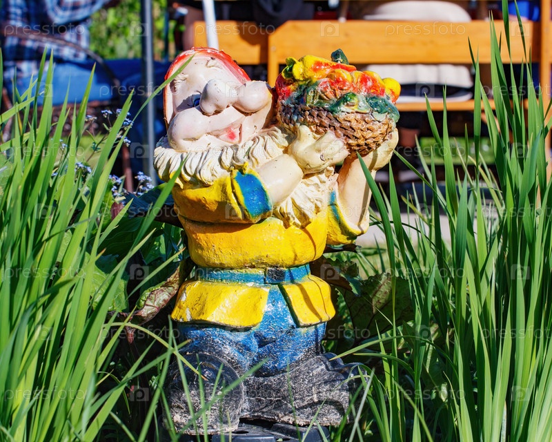 Украшение загородного дома. Игрушечный керамический гном и горшок с цветком. Яркие, насыщенные цвета