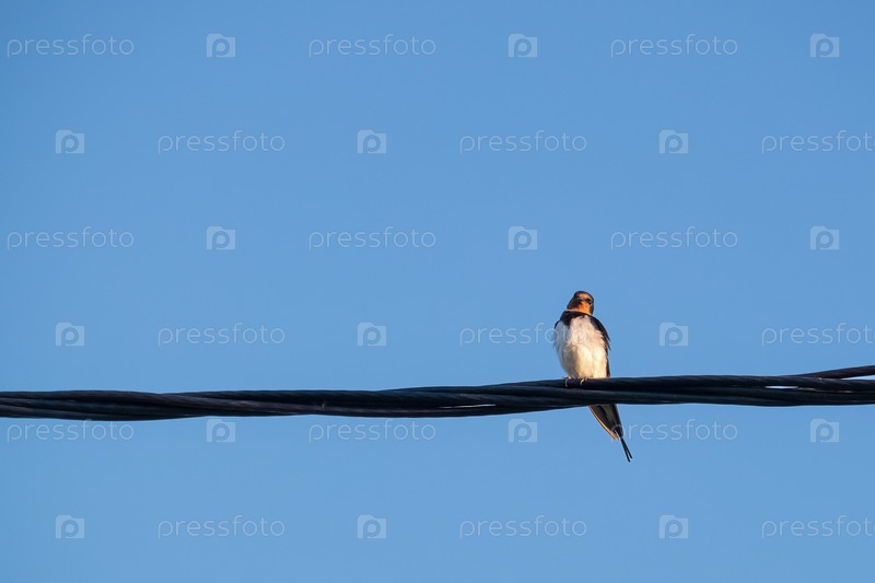 Ласточка сидит на электрическом проводе на фоне голубого неба