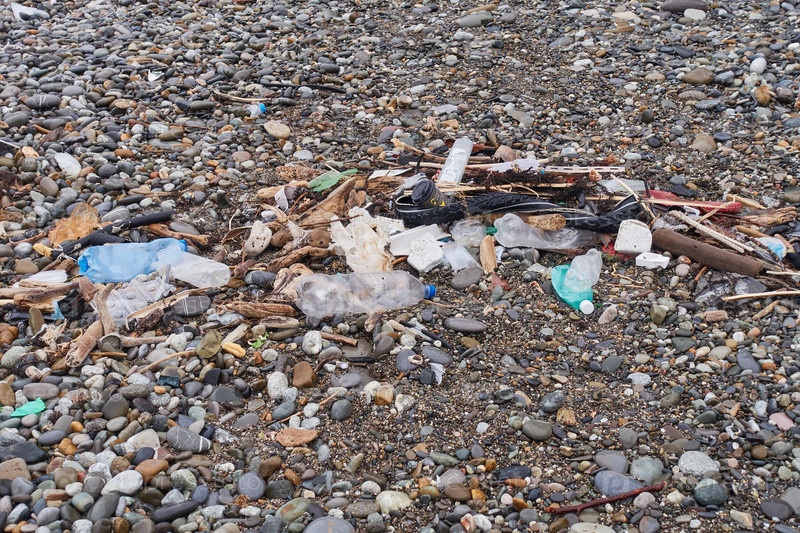 Куча мусора на галечном пляже. Пластиковые бутылки, кофейные чашки, велосипедные покрышки, ветки, бумага