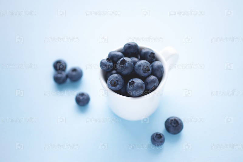 Чашка свежей черники на пастельно-голубом фоне