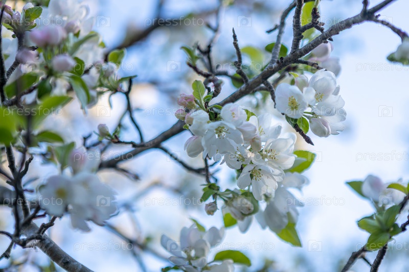 Ветка яблони с розовыми цветами на фоне цветущих деревьев