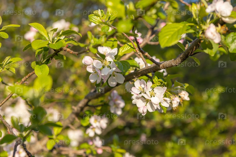 Ветка яблони с розовыми цветами на фоне цветущих деревьев