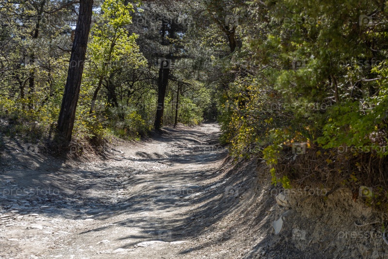 Проселочная дорога проходит через смешанный лес. Солнечное и голубое небо