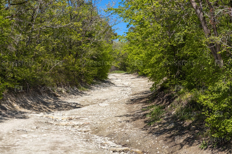 Проселочная дорога проходит через смешанный лес. По обочинам дороги растет трава. Солнечное и голубое небо