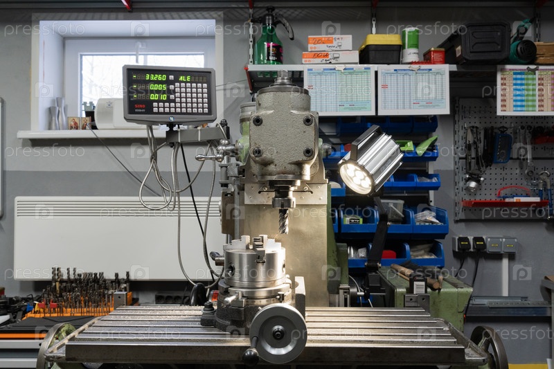 Фрезерный станок. Мастерская, на переднем плане фрезерный станок с ЧПУ, вокруг разные инструменты