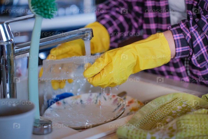 Руки крупным планом. Женщина в желтых перчатках моет посуду, пищевой пластиковый контейнер