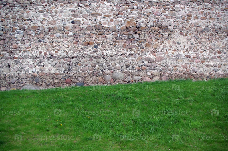 Зеленый газон на фоне каменной стены в виде чередующихся линий фактурного фона