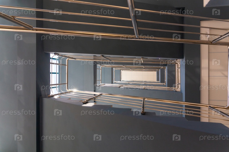 Лестница в бетонном офисном здании нейтральных тонов, облицованная керамической плиткой, с блестящими металлическими перилами из нержавеющей стали, обширное остекление. Солнце светит в окно. Горизонтальный выстрел