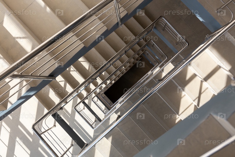 Лестница в бетонном офисном здании нейтральных тонов, облицованная керамической плиткой, с блестящими металлическими перилами из нержавеющей стали, обширное остекление. Солнце светит в окно. Горизонтальный выстрел