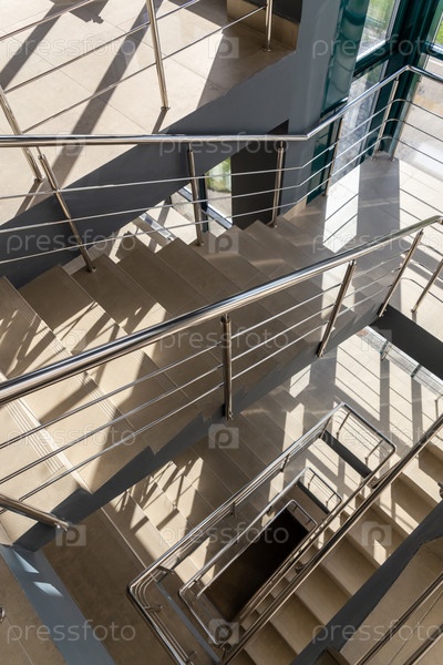Лестница в бетонном офисном здании нейтральных тонов, облицованная керамической плиткой, с блестящими металлическими перилами