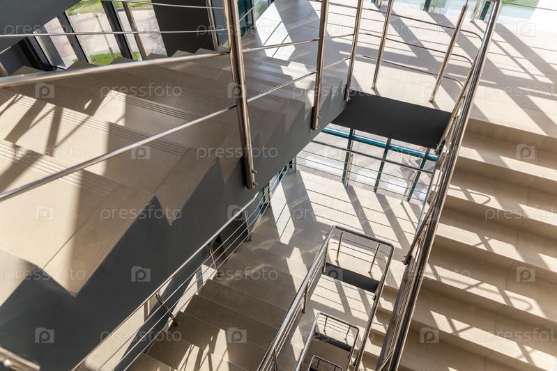 Лестница в бетонном офисном здании нейтральных тонов, облицованная керамической плиткой, с блестящими металлическими перилами