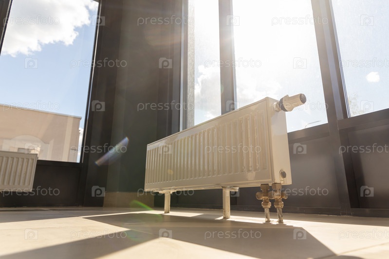 Вертикально установленный радиатор центрального отопления на полу у полностью застекленной наружной стены офисного здания. Белый радиатор в комнате с окном и голубым небом за ним