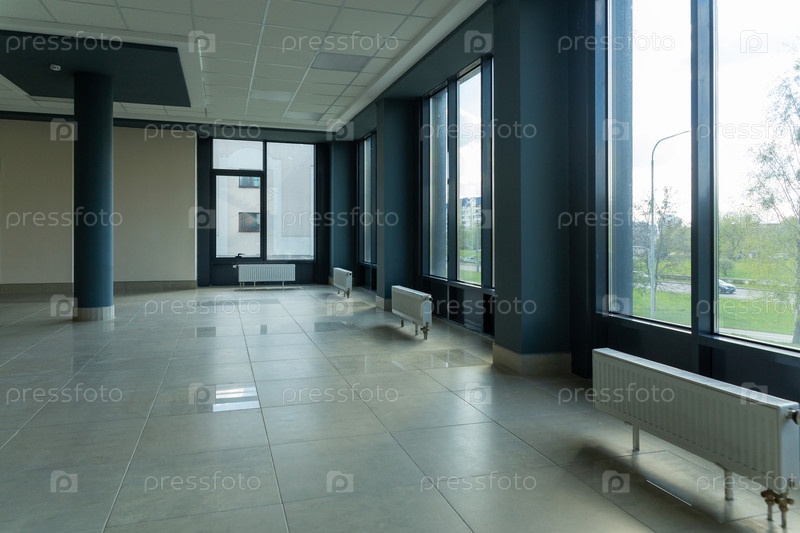 Большая, просторная, пустая комната с огромными окнами и установленными на полу радиаторами центрального отопления с регуляторами температуры