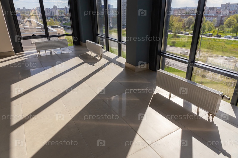 Большая, просторная, пустая комната с огромными окнами и установленными на полу радиаторами центрального отопления с регуляторами температуры