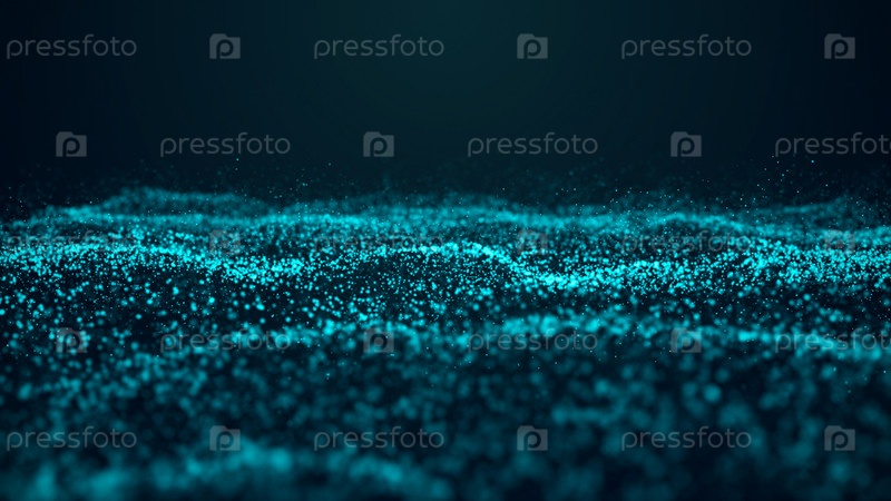 Волна частиц. Абстрактный фон с динамической волной. Синий фон с движущимися частицами. 3d визуализация