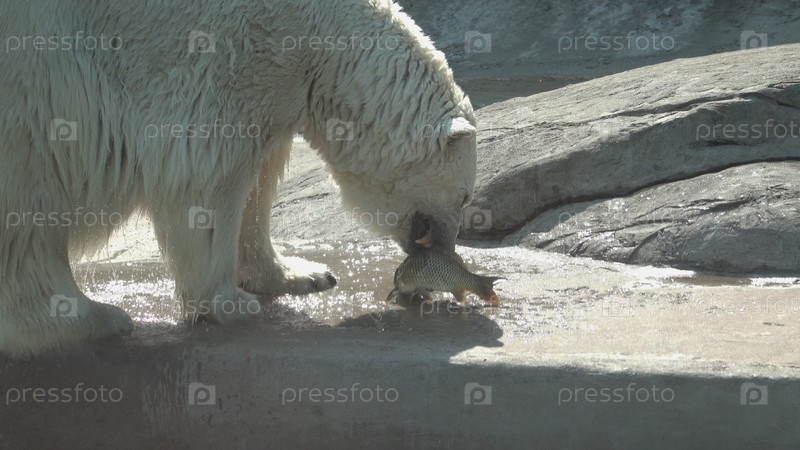 Белый медведь ловит рыбу и ест ее на берегу