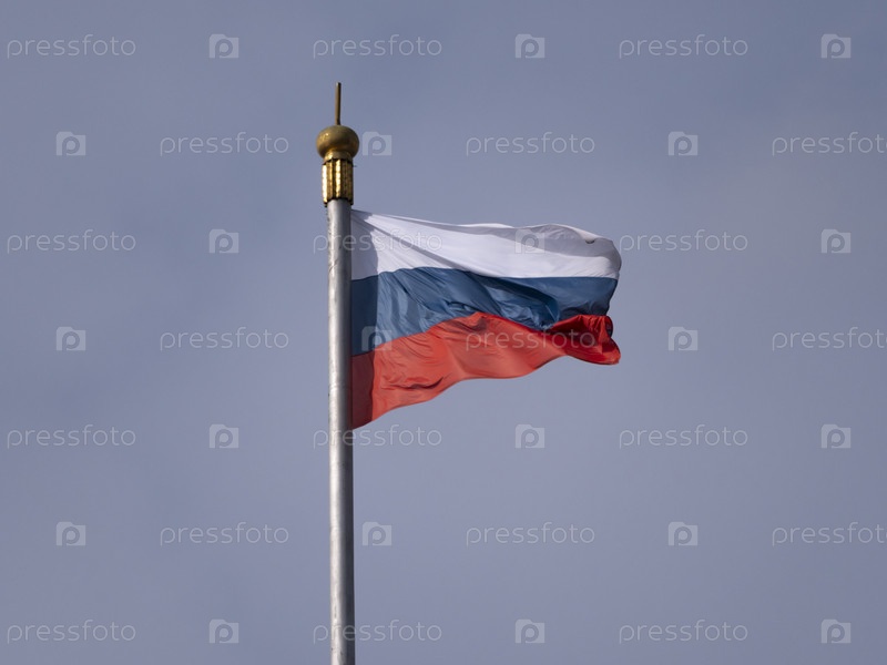 Российский флаг развевается на ветру на флагштоке
