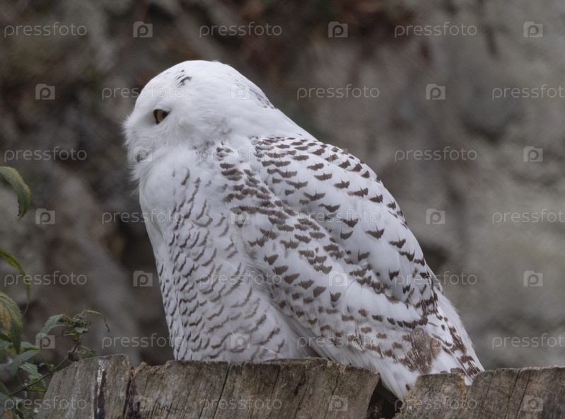 Снежная сова Bubo scandiacus или Nyctea scandiaca сидит на палочке