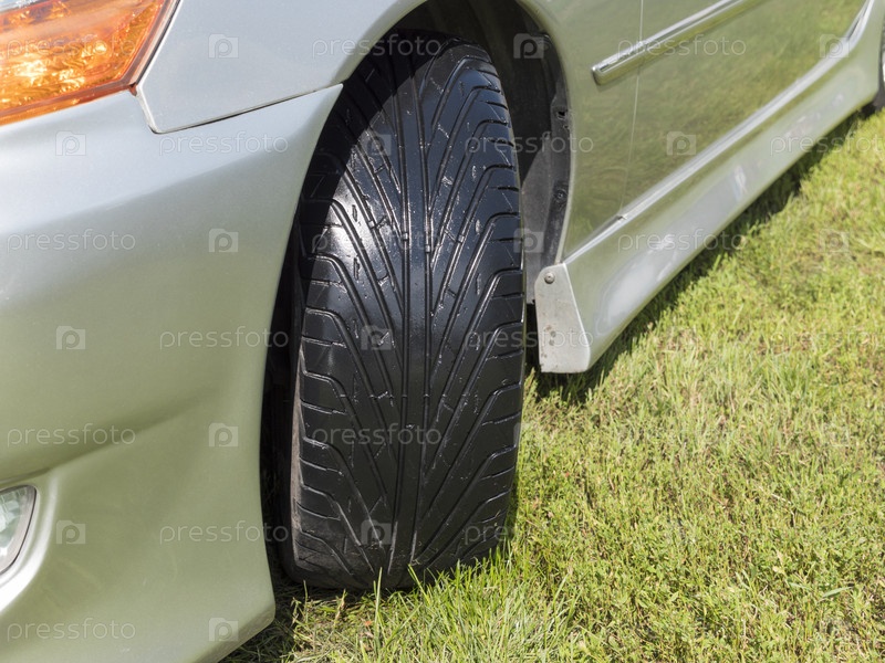 Закройте автомобильную шину на зеленой траве