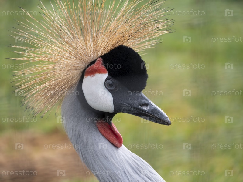 Красивая птица, серый венценосный журавль с голубым глазом и красным плетением