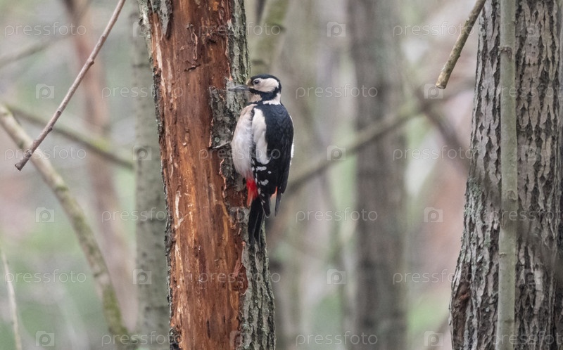 Большой пятнистый дятел ищет еду на дереве