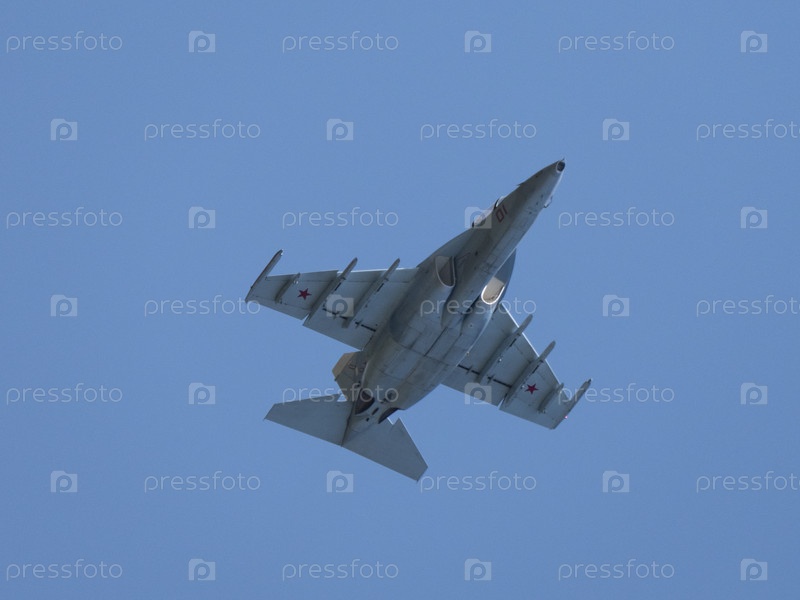 Москва Россия Аэродром Жуковский 31 августа 2019 года: пилотажный Як-130 выполняет демонстрационный полет международного аэрокосмического салона МАКС-2019
