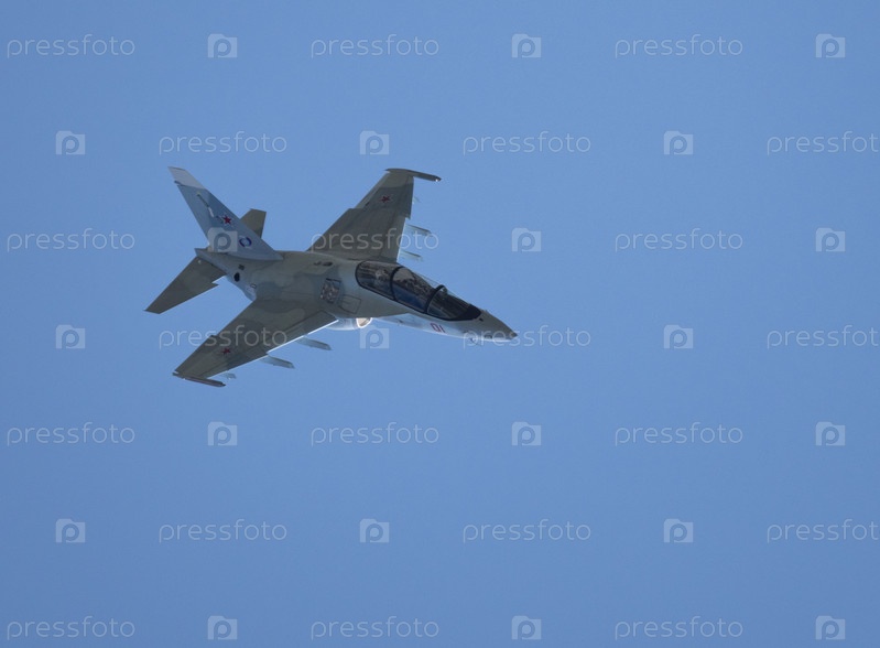 Москва Россия Аэродром Жуковский 31 августа 2019 года: пилотажный Як-130 выполняет демонстрационный полет международного аэрокосмического салона МАКС-2019