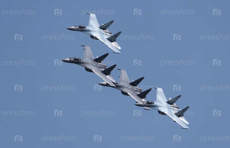 Москва Россия Аэродром Жуковский 31 августа 2019 года: Пилотажные группы "Соколы России" на самолетах Су-30 Международного аэрокосмического салона МАКС-2019