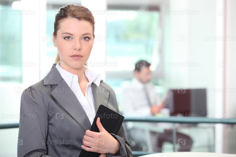 Деловая женщина позирует с папкой на работе