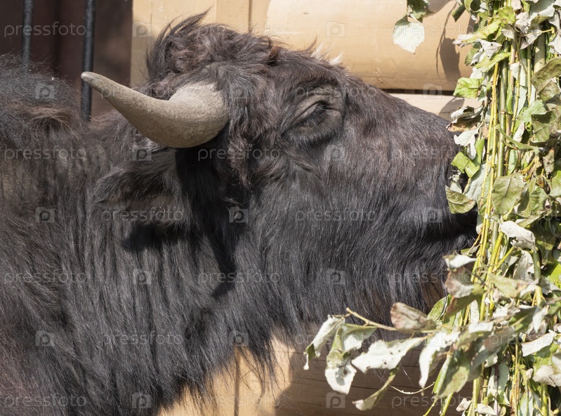 Таро Баффало ест свежие зеленые ветки деревьев