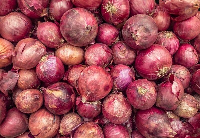 На фоне большого количества средних фиолетовых луковиц. Фон из овощей на витрине. Сбор луковиц фиолетового лука