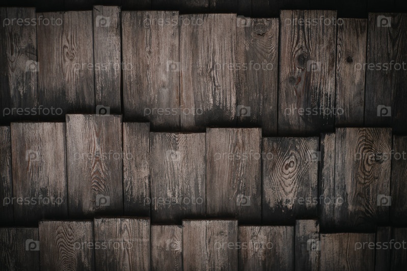 Фон из темных деревянных досок, плотно прилегающих друг к другу, в несколько рядов. Деревянная крыша. Деревянные доски с хорошо видимой древесной текстурой