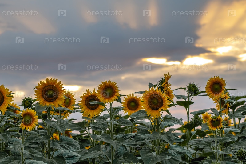 Поле с множеством цветущих подсолнухов во время заката